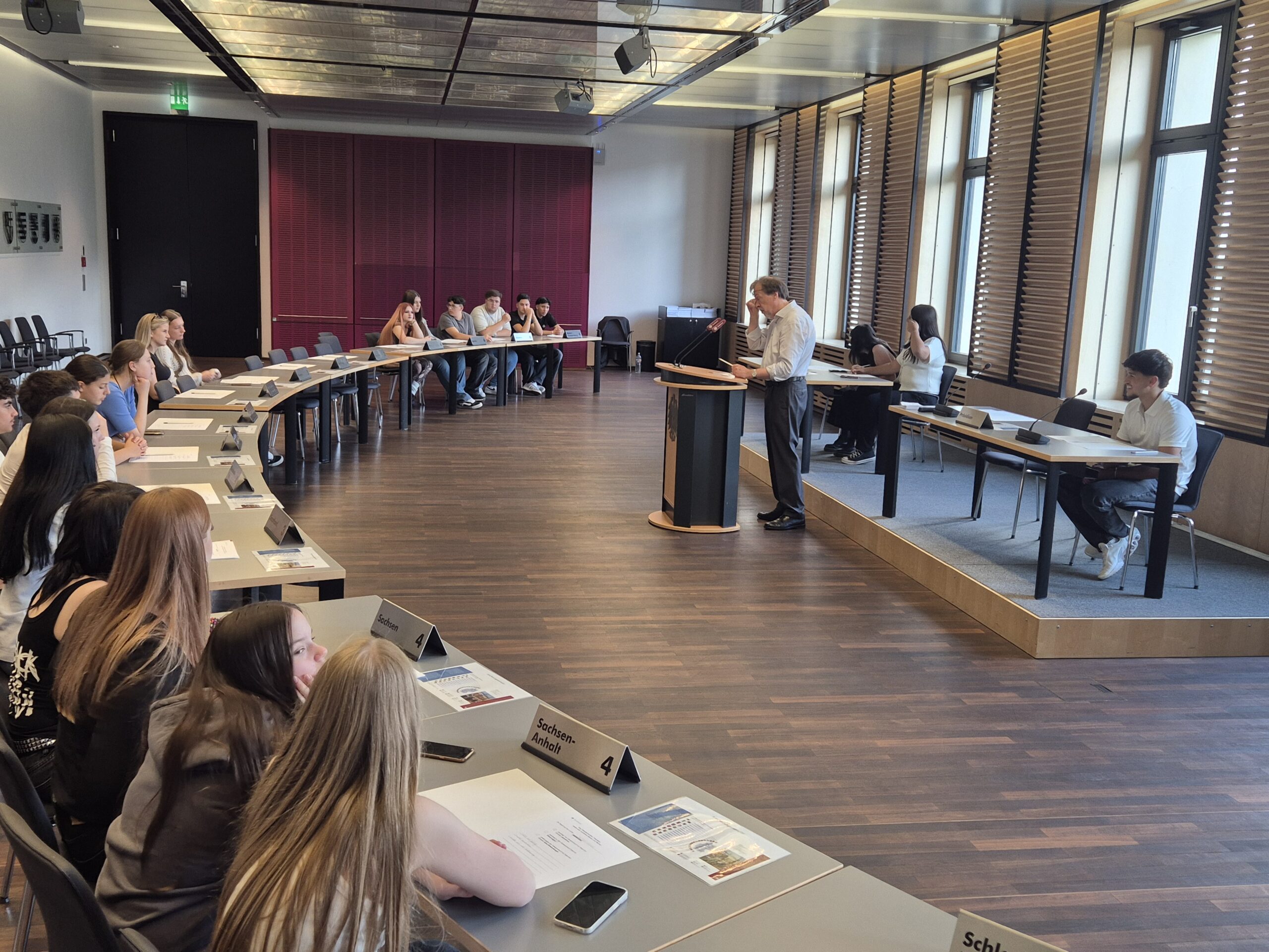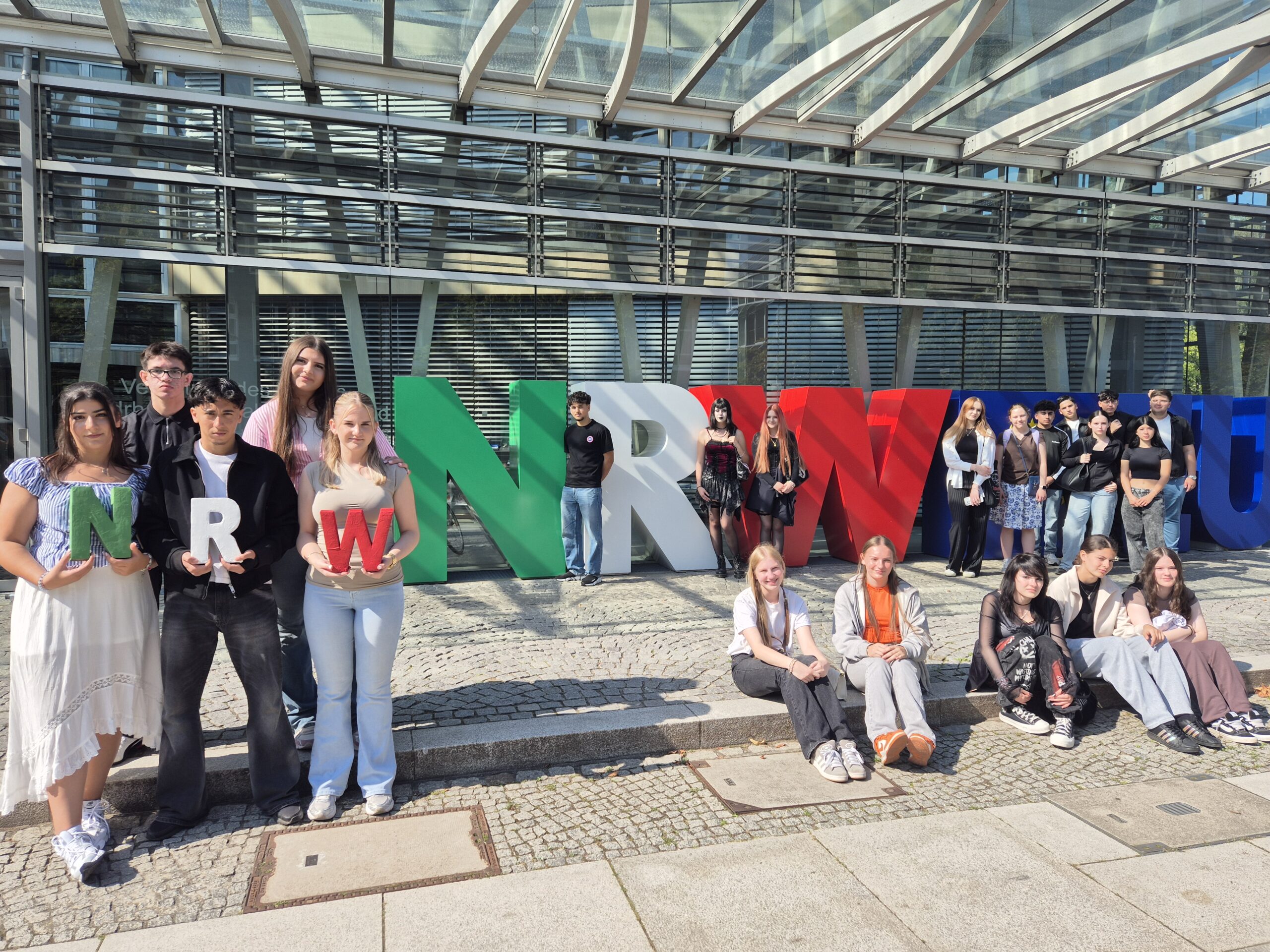 Bei einem geführten Stadtrundgang lernten die Schülerinnen und Schüler die wichtigsten Sehenswürdigkeiten Berlins kennen. Spannend war der Besuch des Bundesrates. Von der Zuschauertribüne konnte man in den Plenarsaal des Bundesrates hineinsehen. Bei einem Rollenspiel konnten die Jugendlichen in die Rollen der Politiker „hineinschlüpfen“ und ein Gesetzesabstimmungsverfahren nachstellen. In der NRW-Landesvertretung wurden die beiden Klassen 10b und 10c vom Bevollmächtigten des Landes beim Bund Herrn Dr. Matthias Rossbach persönlich begrüßt. Zum Anlass des Besuches der NRW-Landesvertretung wurde der von der Klasse 10c in einem Ausschreiben gewonnener Zuschuss von 1500,- Euro. Überzeugt hat die Jury das Bewerbungsvideo und ein Klassen-ABC mit diesen tollen Buchstaben. Wunderbare Ausblicke auf Berlin-City bekam man vom Schiff aus auf der Spree.