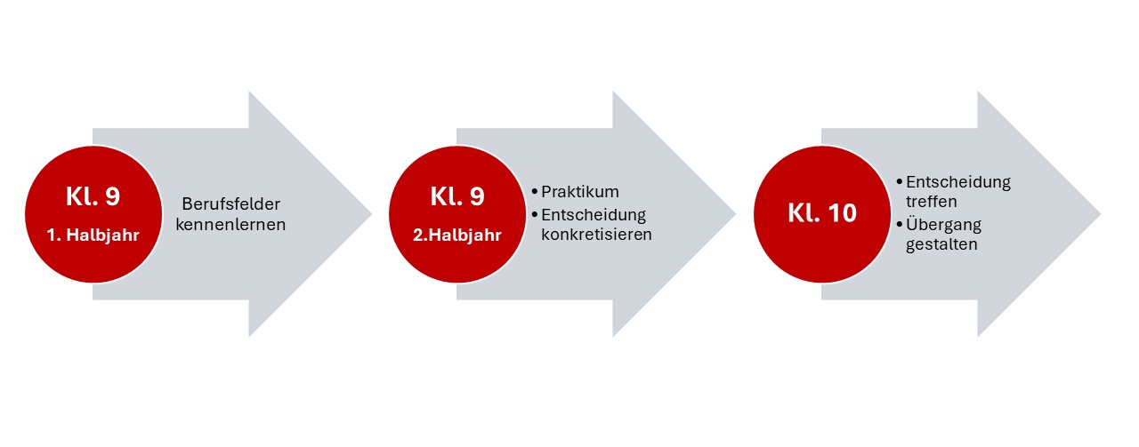 Im ersten Halbjahr der 9. Jahrgangsstufe werden auf der Bildungsmesse Berufsfelder und Möglichkeiten aufgezeigt. Zu Beginn des 2. Halbjahrs findet das dreiwöchige Schülerbetriebs-Praktikum statt. In der 10. Jahrgangsstufe geht es darum Entscheidungen zu begleiten und den Übergang von der Schule in den Beruf oder zu einer anderen Schule zu begleiten.