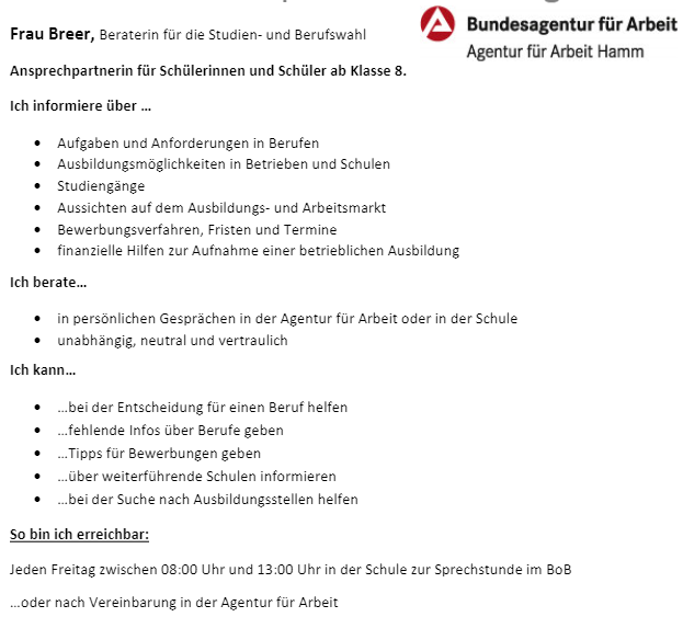 Frau Breer ist jeden Freitag zwischen 8.00Uhr und 13.00Uhr in der Schule zur Sprechstunde im Berufsorientierungsbüro (BoB) oder nach Vereinbarung in der Agentur für Arbeit erreichbar.